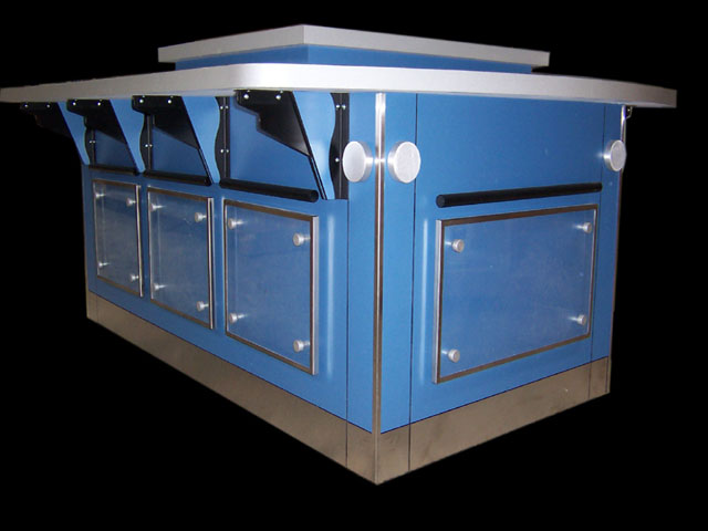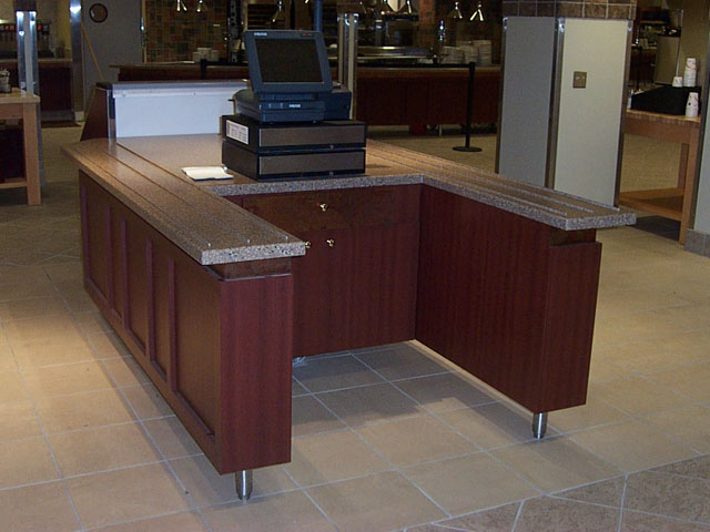 (Photo Above) Hanex Solid Surface Top with Hanex Tray Runners, Laminated Base with Stainless Accents, Decorative Panels and Handles, Made to fit around merchandiser.