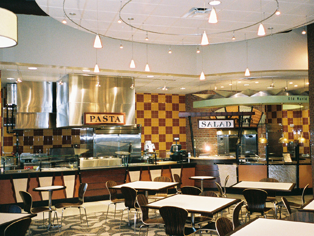 (Photo Above) Metal Laminate Counters with Custom Powder Coated Vertical Glass Sneeze Guards and Decorative Metal Accents with Black ABS Toe Kick.